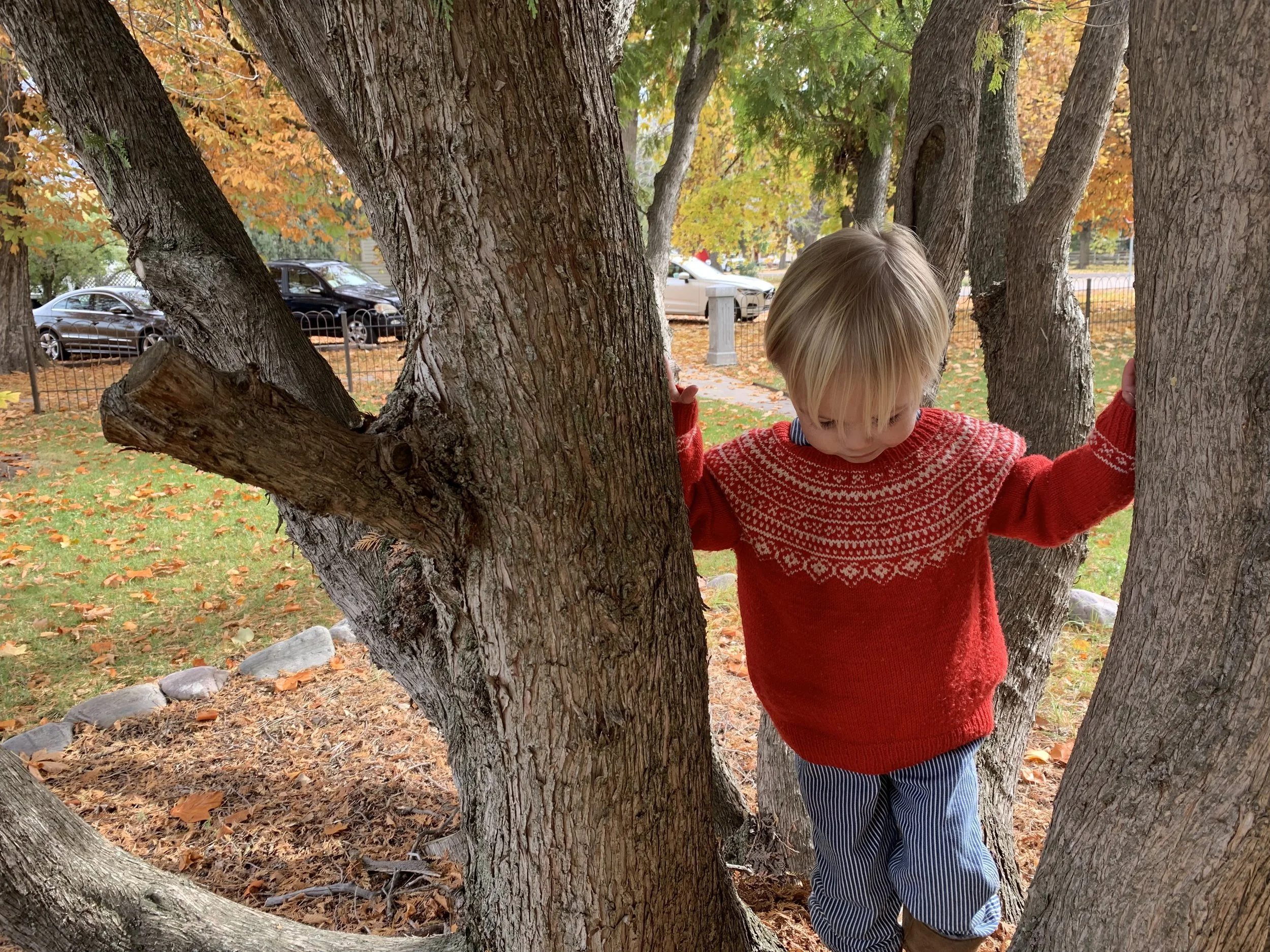 Fritz (2) playing house in the tree (shrub?) for the first time