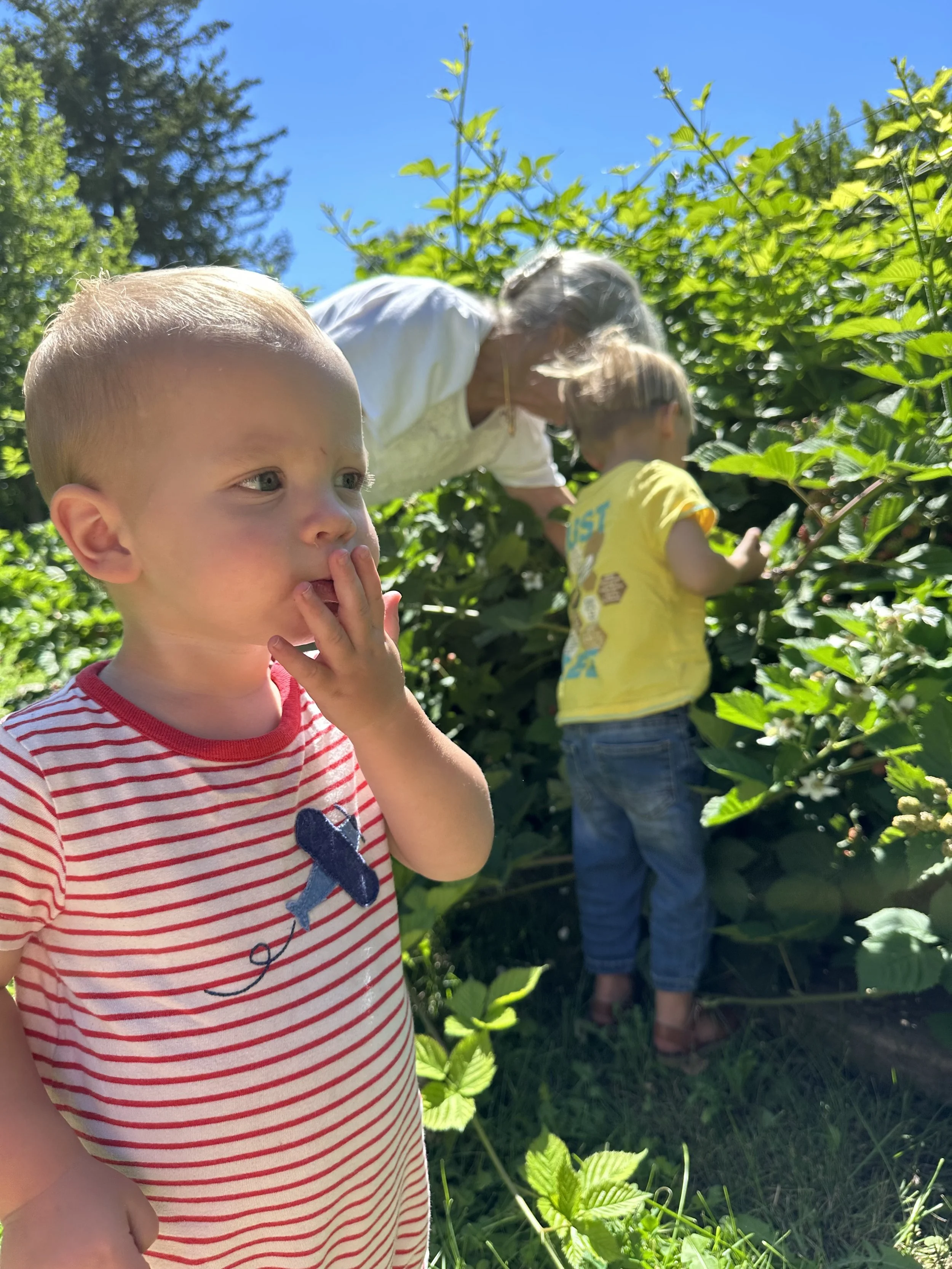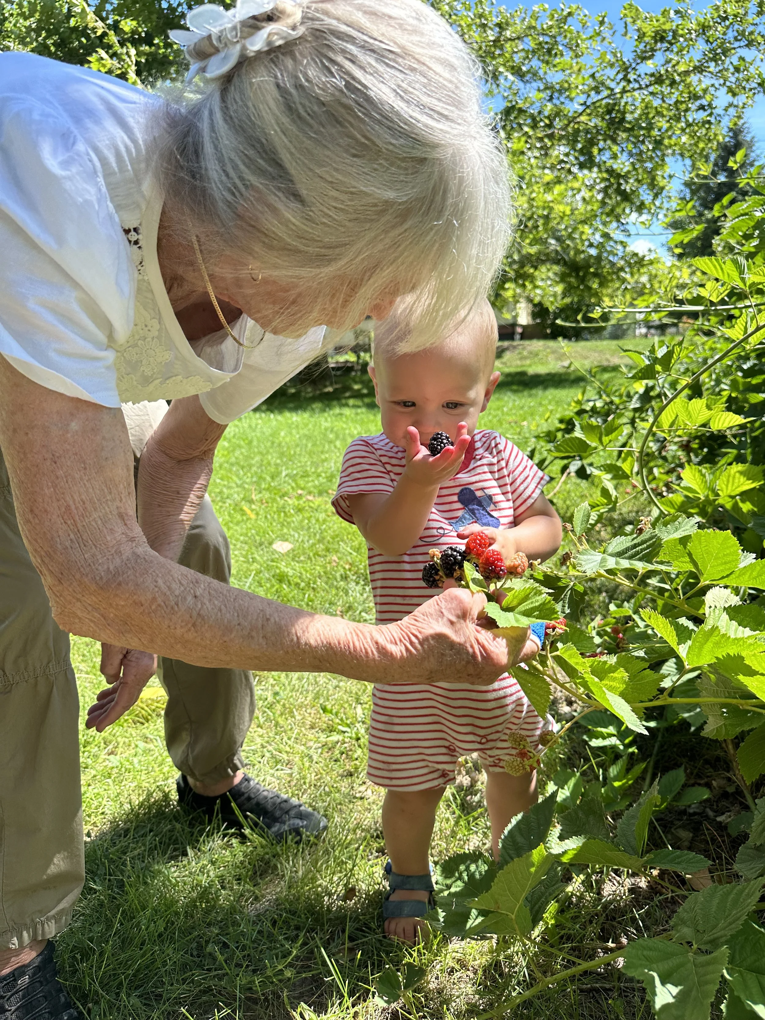 We float squash boats down the irrigation ditch and the boys play house in my old tree. They eat as many strawberries and raspberries as they can out of the yard and we’re counting down the days to blackberry season. They leap out of the car when we arrive and rush to my grandma, who is waiting on the porch.