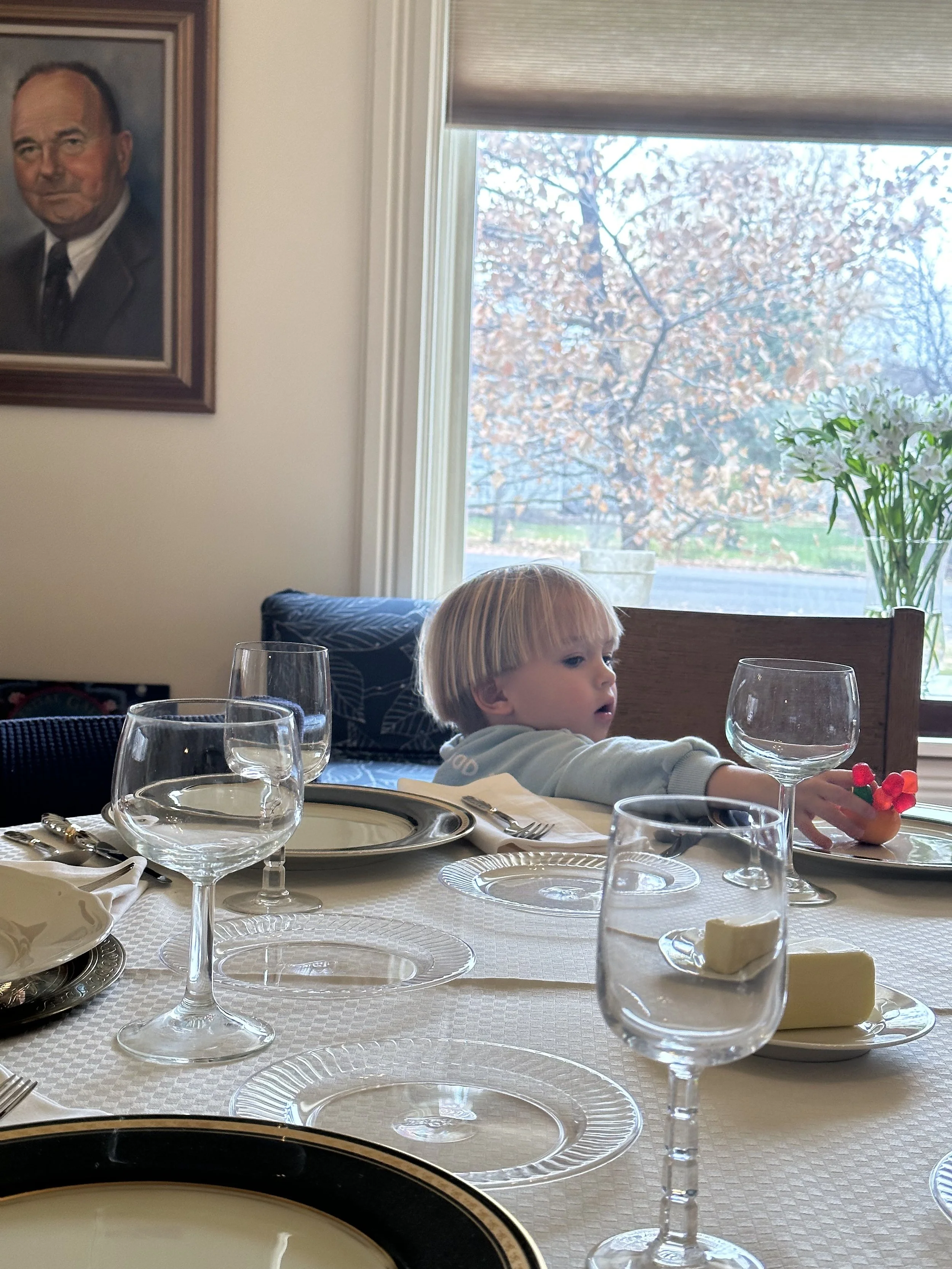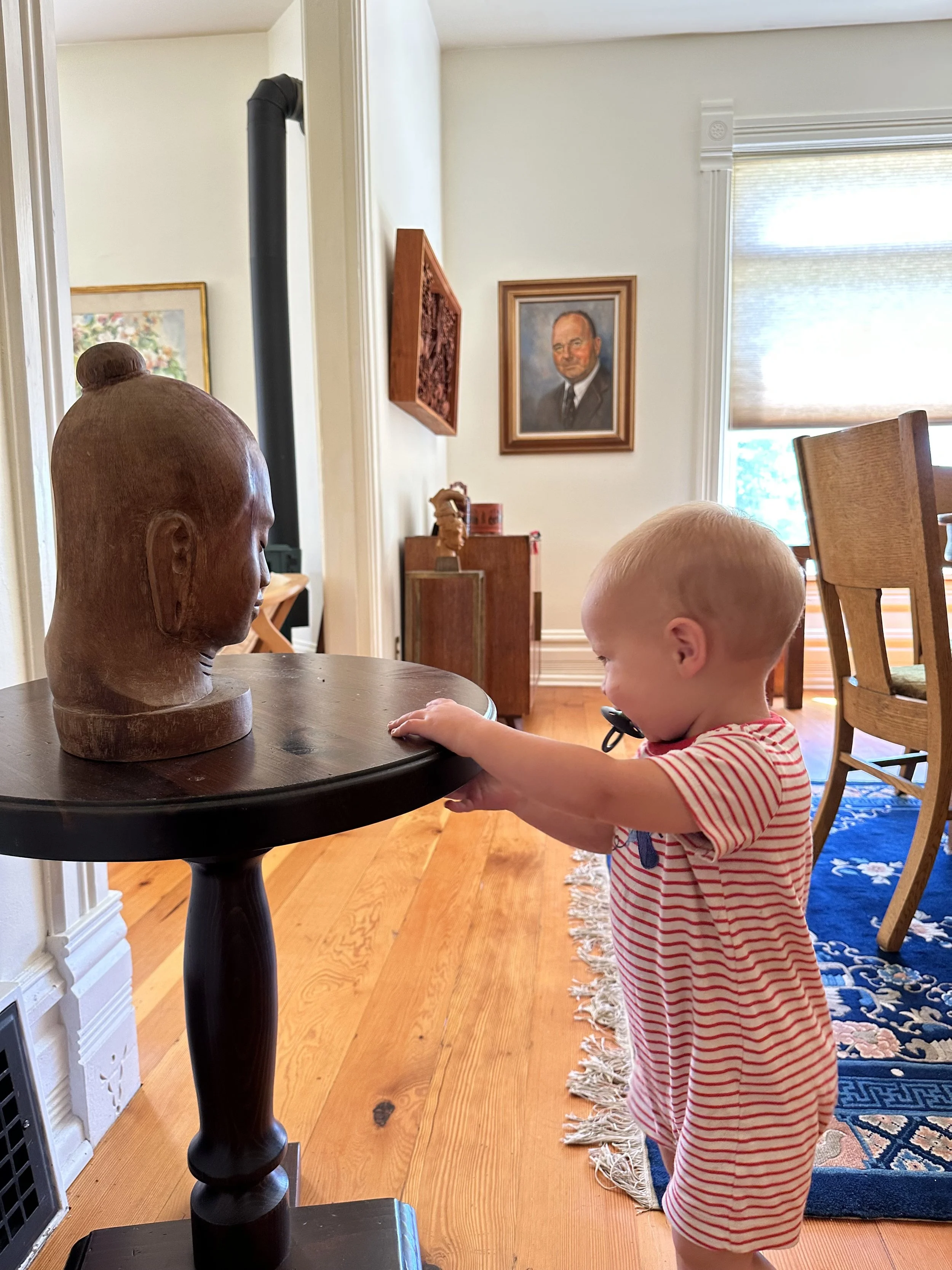 Lars (1) had just learned the name of face parts (eyes, ears, nose). He kept going up to this dude and saying “nose.” That’s a portrait of my Great-Grandpa Hansen, which used to hang in this very dining room, in the background.