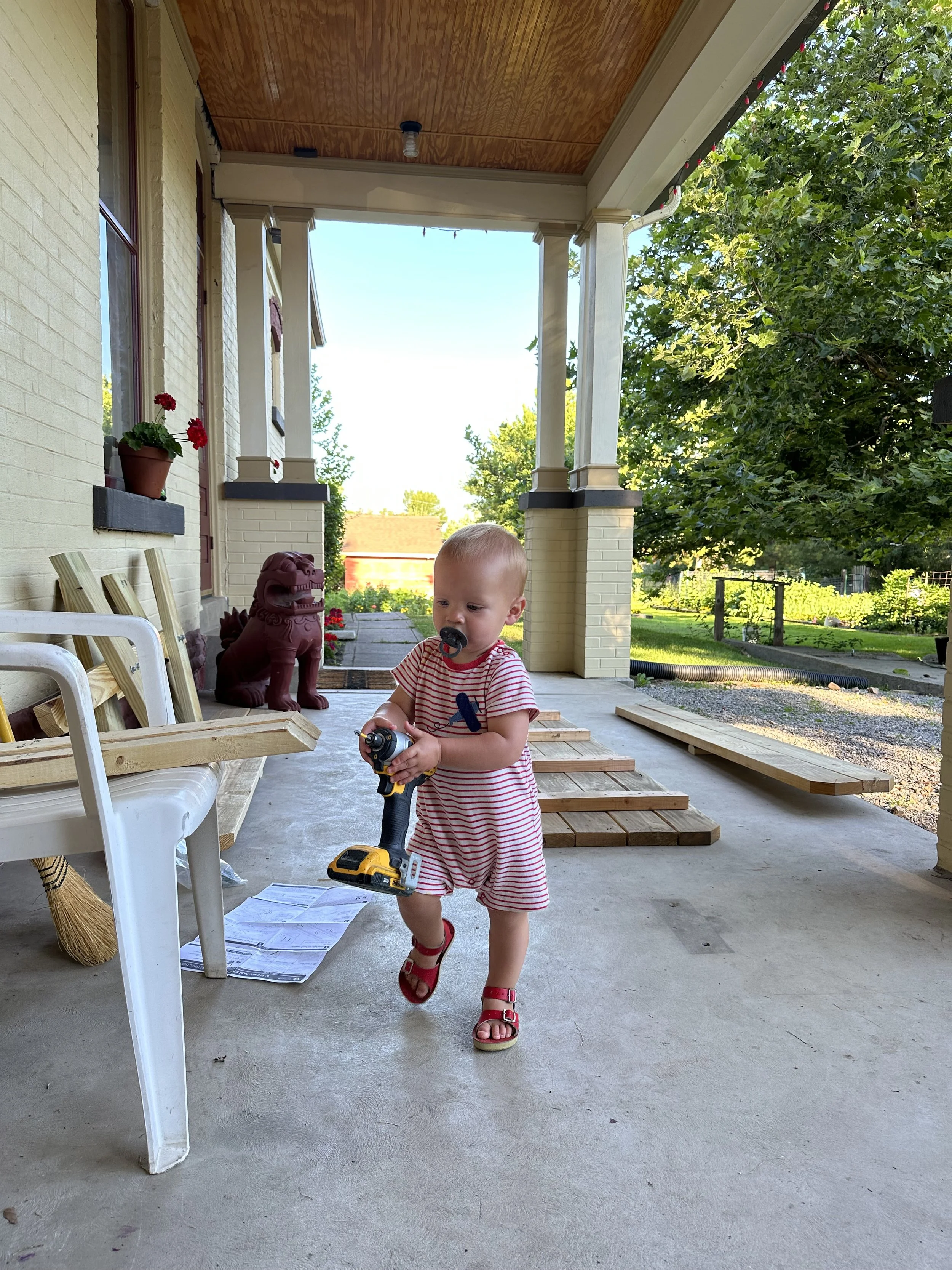 Lars has named the dog in the background “dinosaur” and he and Fritz feed him, you guessed it, lollipops. Also gotta love a baby with a power tool.
