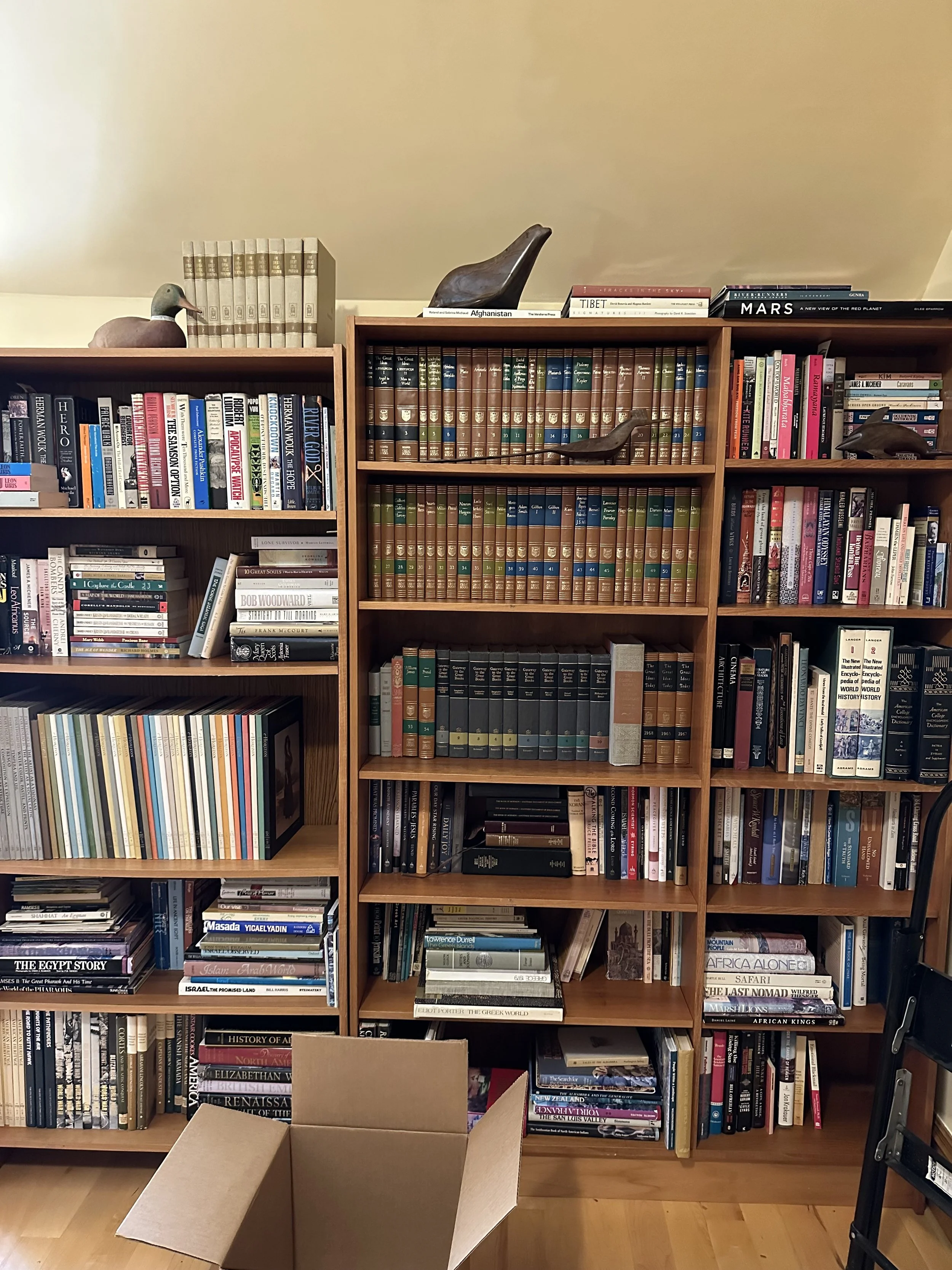 Last summer we helped her moved in. We painted some walls and hauled boxes and arranged the books in the library on the landing -- exactly where her parents had had their library.