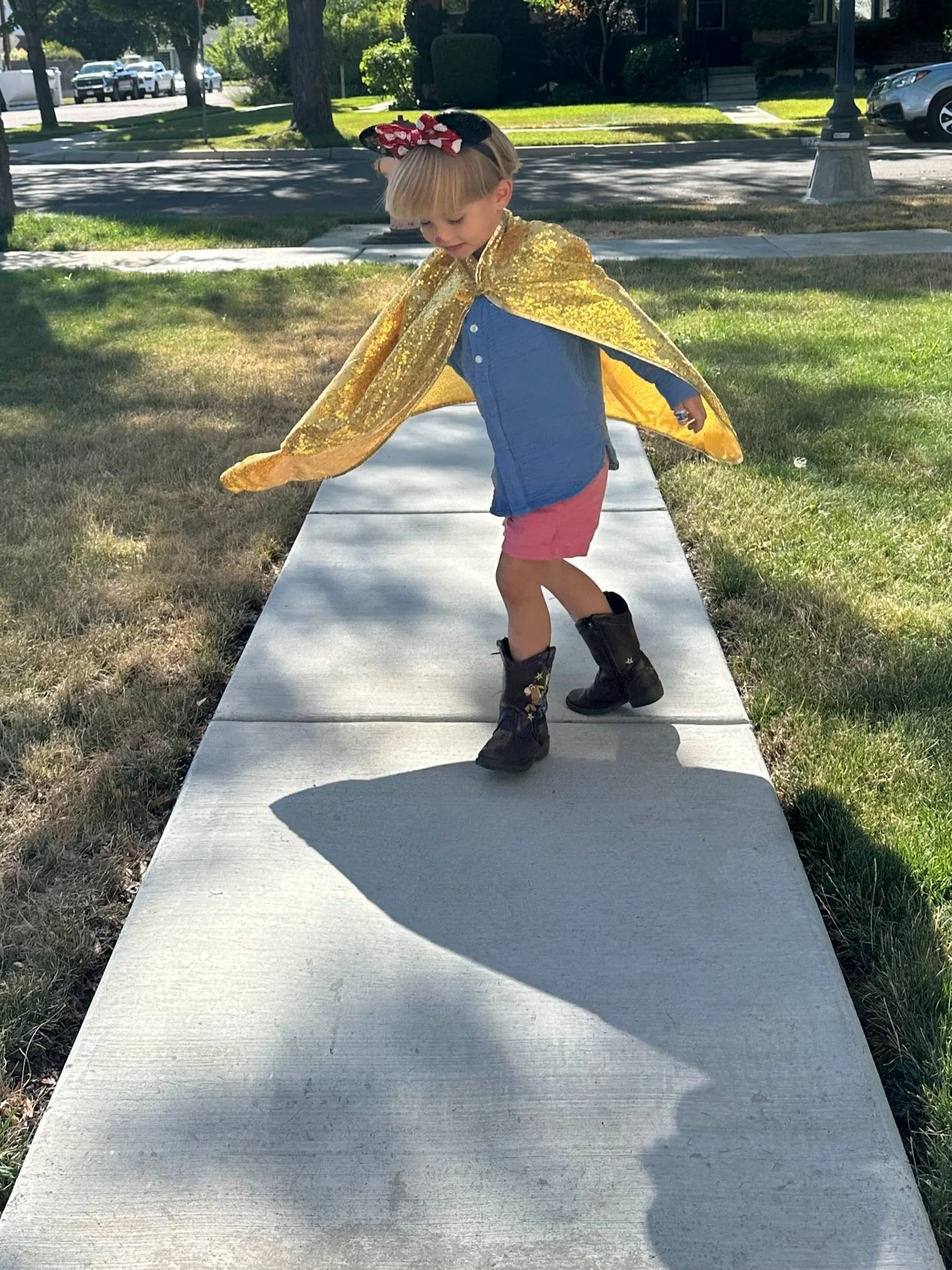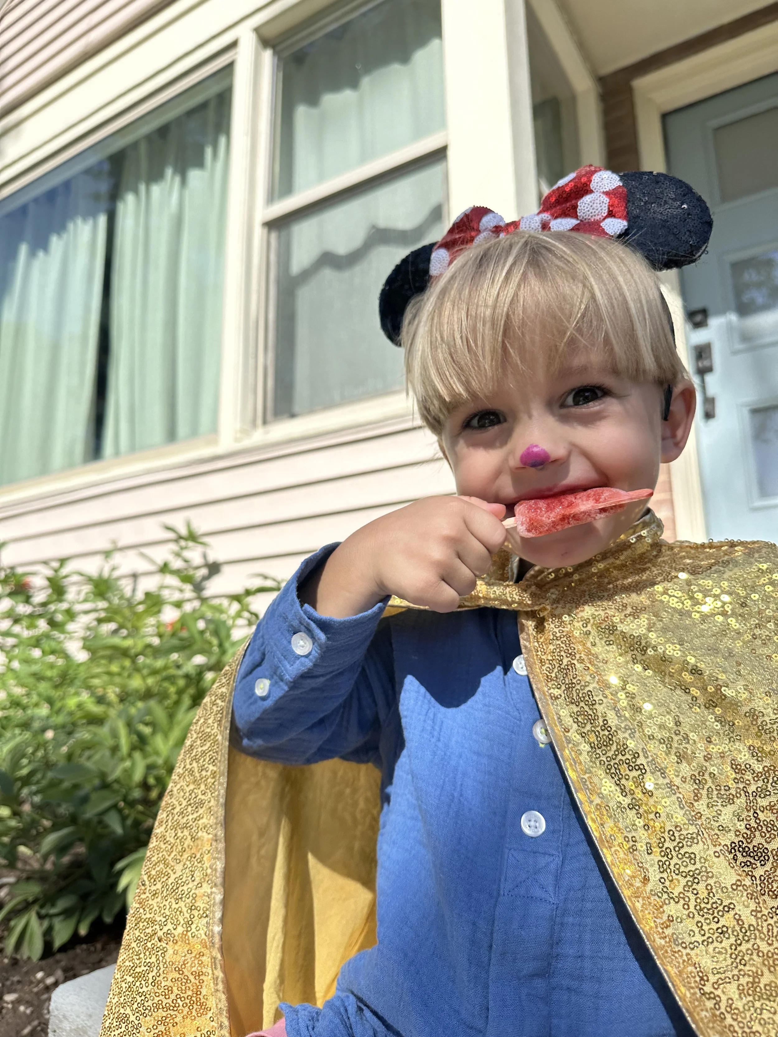 and then he put on a sparkly gold cape and glittery Minnie Mouse ears he pulled out of the dress up box and wore them to the neighborhood ice cream party.