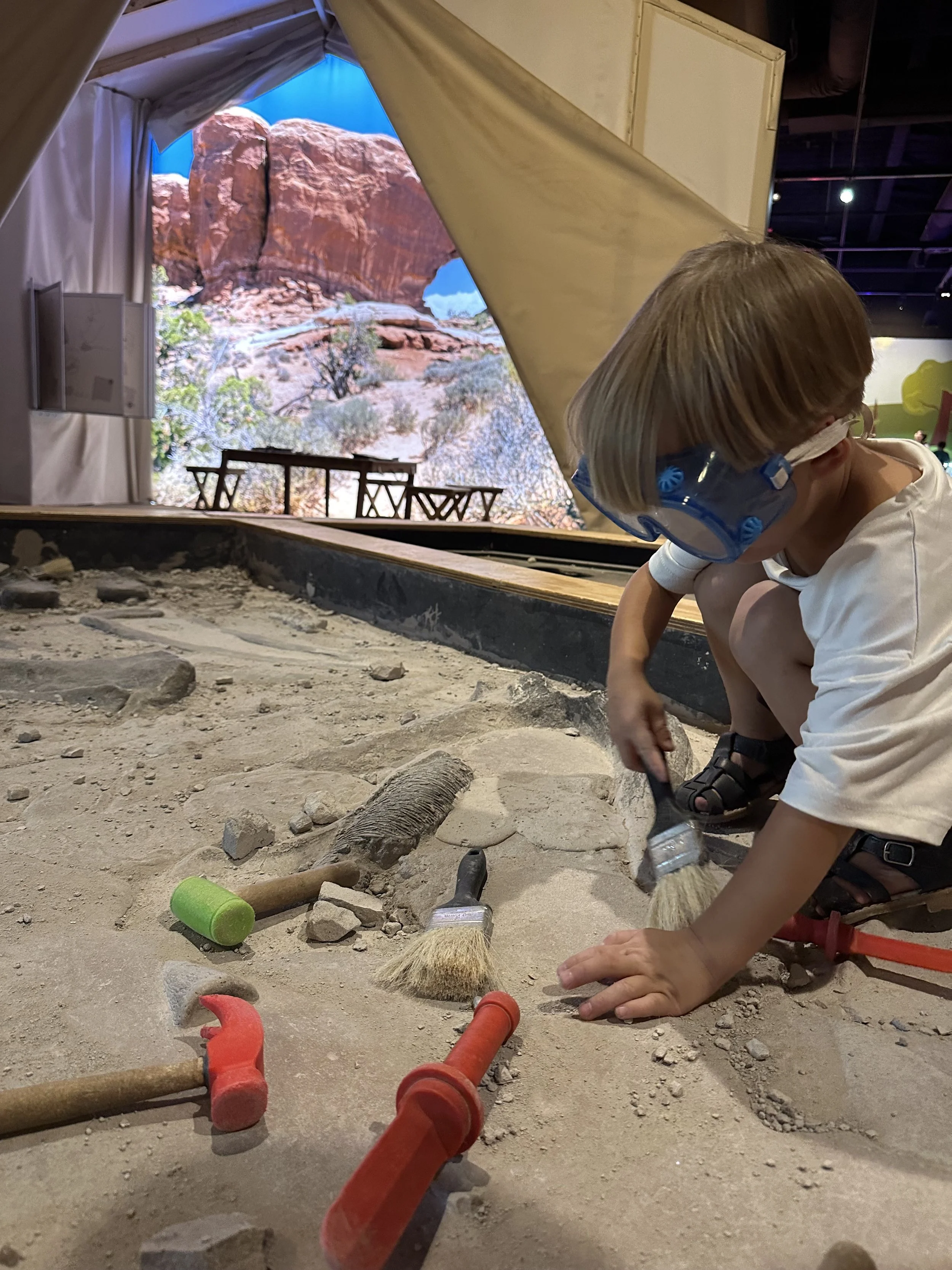 We went to the children’s museum this week, and TOTAL bonus, they have a new Dino dig exhibit. Fritz was completely concentrated on brushing off this lil Dino bone, his tongue out and everything.